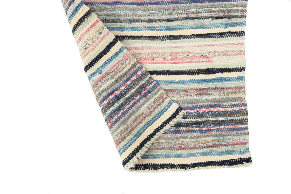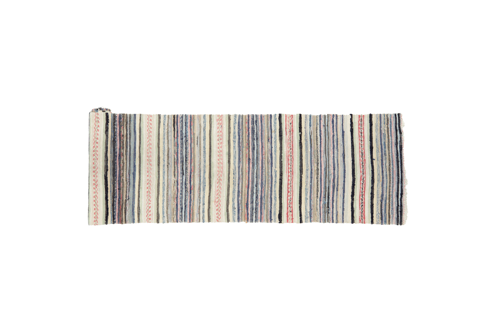 Banded plain weave with soft and flexible handle. Thin stripes in violets and grays, with cream, mint, navy, and rose highlights.