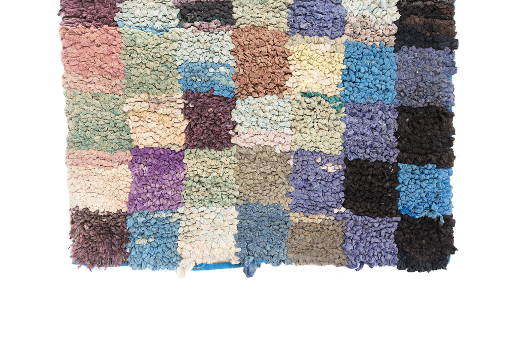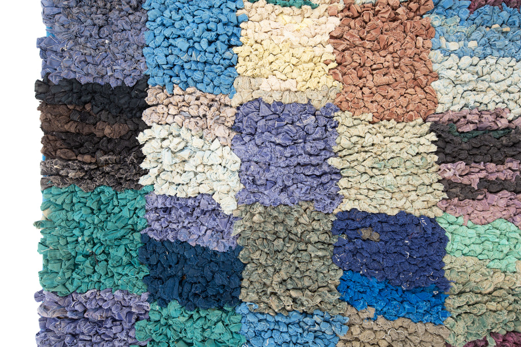 c. 1940's, Shaker attributed. Balanced cool-toned checkerboard arrangement. Malachite, peacock, cobalt, shell, aubergine, charcoal, and hydrangea. Substantial cotton remnant looped on a burlap backing. Dense and fragile, weak ground. Best decoratively.