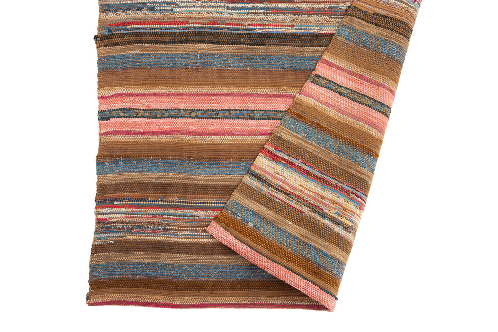 Shaker attributed, c. 1900. Classic tabby multi-toned weave. Variegated bands of striping in sand, bronze, melon, peach, marine and charcoal. Deep gray, lavender, mandarin, lambs ear and rose. Thin and flexible.  Exceptionally long, never used!